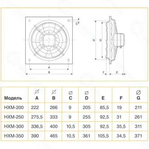 Модели от HXM-200 до HXM-350: Классс защиты IP44, класс изоляции B, с шариковыми подшипниками, встроенной термозащитой. Вентиляторы оснащены кабелем длиной 50 см.