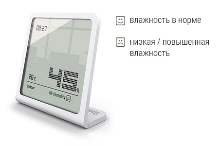 Еще один приятный бонус Selina – визуальный «Анализ влажности»: если влажность в норме (40–60%), смайлик улыбается, а если слишком низкая (<40%) или высокая (>60%) – грустит. При этом диапазон измерения влажности и температуры у Selina очень широкий: от 10% до 98% и от -10°С до +50°С, соответственно. То есть использовать этот прибор можно практически в любом помещении, за исключением лабораторий с экстремальными условиями.