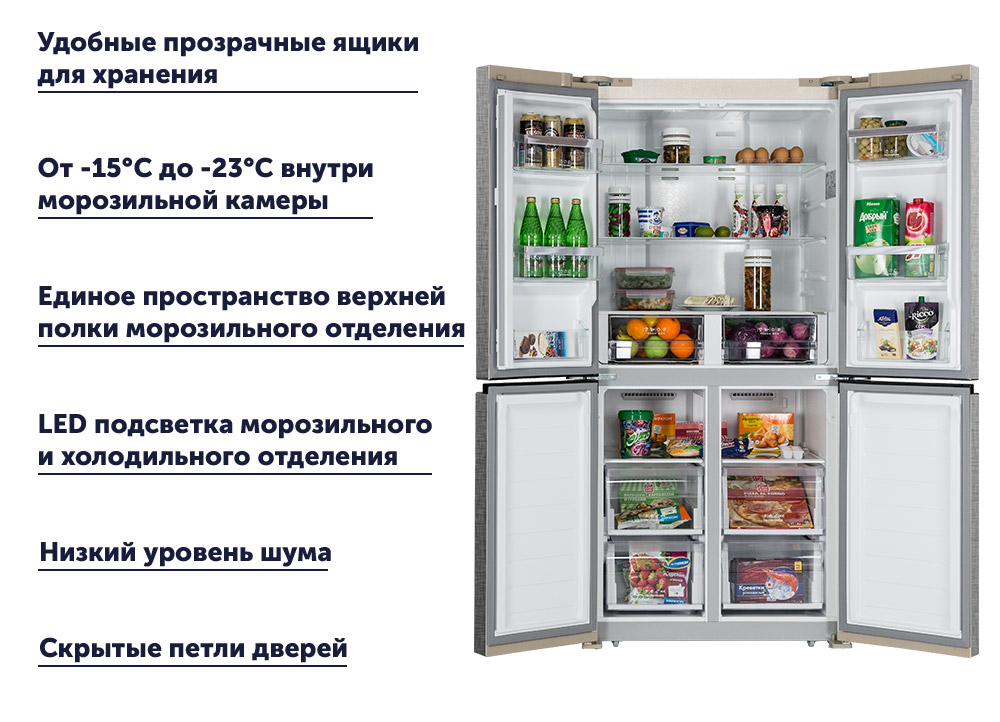 Технологичные, современные холодильники HIBERG с повышенной вместительностью избавят вас от лишних походов в магазин. Стильный дизайн холодильника позволит ему вписаться в любую обстановку и сделает Вашу кухню еще прекрасней.Холодильник очень вместителен, в нем много места для охлаждения и заморозки продуктов любой формы и размера. Он имеет четыре двери, которые широко открываются, поэтому Вы можете охватить всё содержимое одним взглядом.