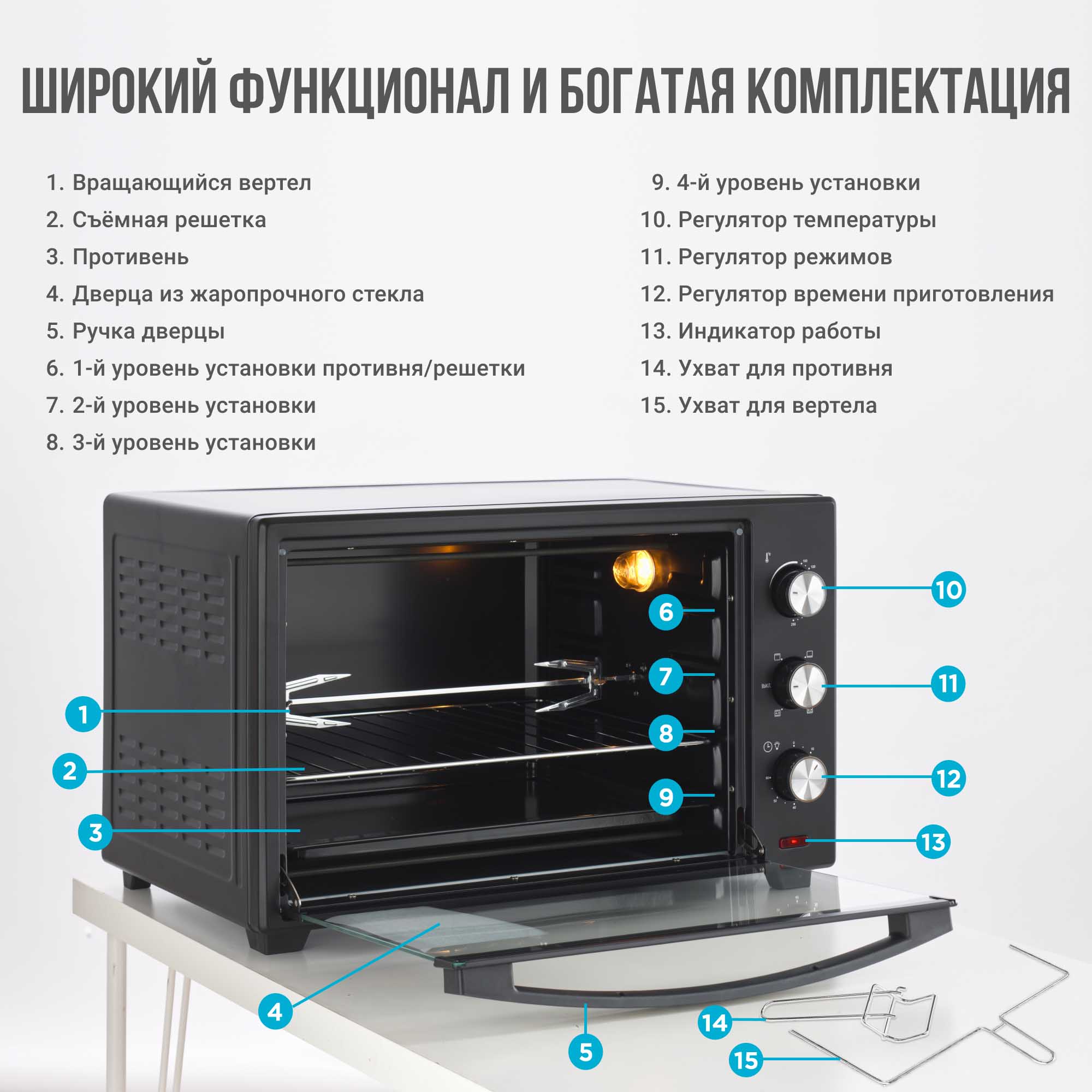 Механическое управление с большими удобными переключателями гарантирует легкость в управлении прибором. Вы просто выбираете один из 5 режимов работы, температуру (до 250 градусов), а также время приготовления (до 60 минут). По истечении установленного срока печь оповестит вас звуковым сигналом.