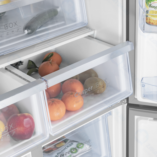 - Умный холодильник Cross Door c системой Total Frost c компрессором, оснащенным инверторным мотором, благодаря чему холодильник работает тихо, долговечней и экономичнее.