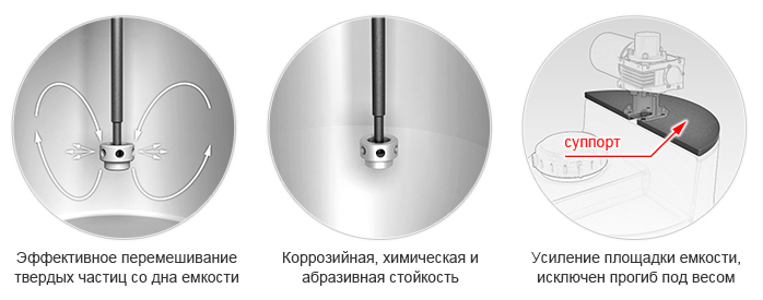 Мешалка устанавливается на емкость с использованием специальной усилительной прослойки (суппорта) - для усиления площадки емкости, что исключает ее прогиб под весом мешалки.