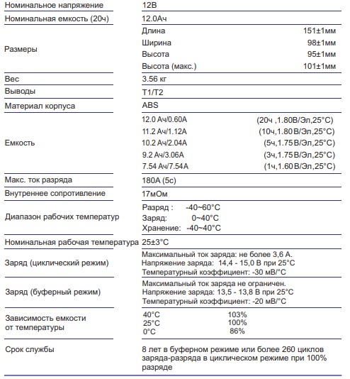 | Тип | Необслуживаемая герметичная кислотно-свинцовая |
