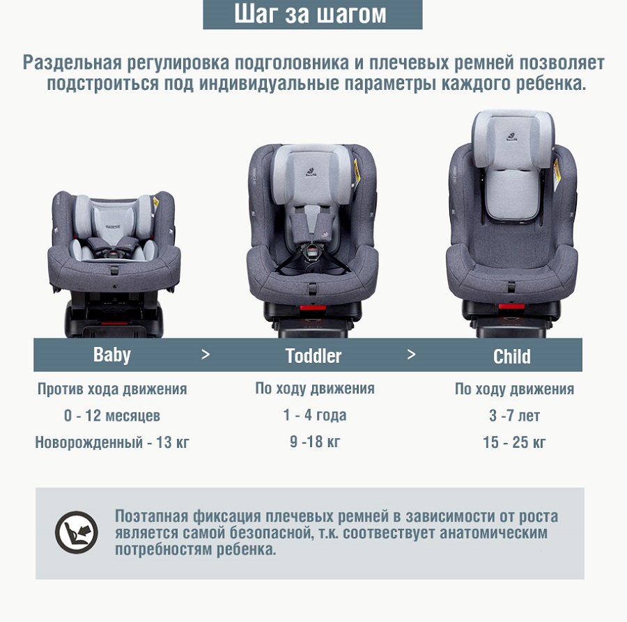 - Эргономичная безопасная спинка, которая обеспечивает полную поддержку головы, шеи и поясницы ребенка на каждом этапе развития;