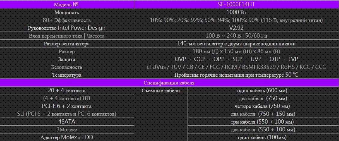 - Сертификация 80 PLUS ® Titanium, эффективность 90%, 92%, 94%, 90% при 10%, 20%, 50%, 100% номинальная нагрузка.