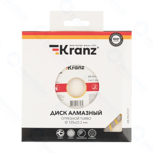 Диск алмазный отрезной Turbo 125x22.2 мм KRANZ предназначен для сухой резки строительных материалов, таких как природный и искусственный камень, армированный бетон, кирпич, керамика. Используется в угловой шлифовальной машине, ручном электрическом плиткорезе, штроборезе. Материал изделия: инструментальная сталь, синтетический алмаз. Процесс резки сопровождается воздушным охлаждением. Срок годности не ограничен. Хранить в сухом прохладном месте. Использовать строго по назначению.