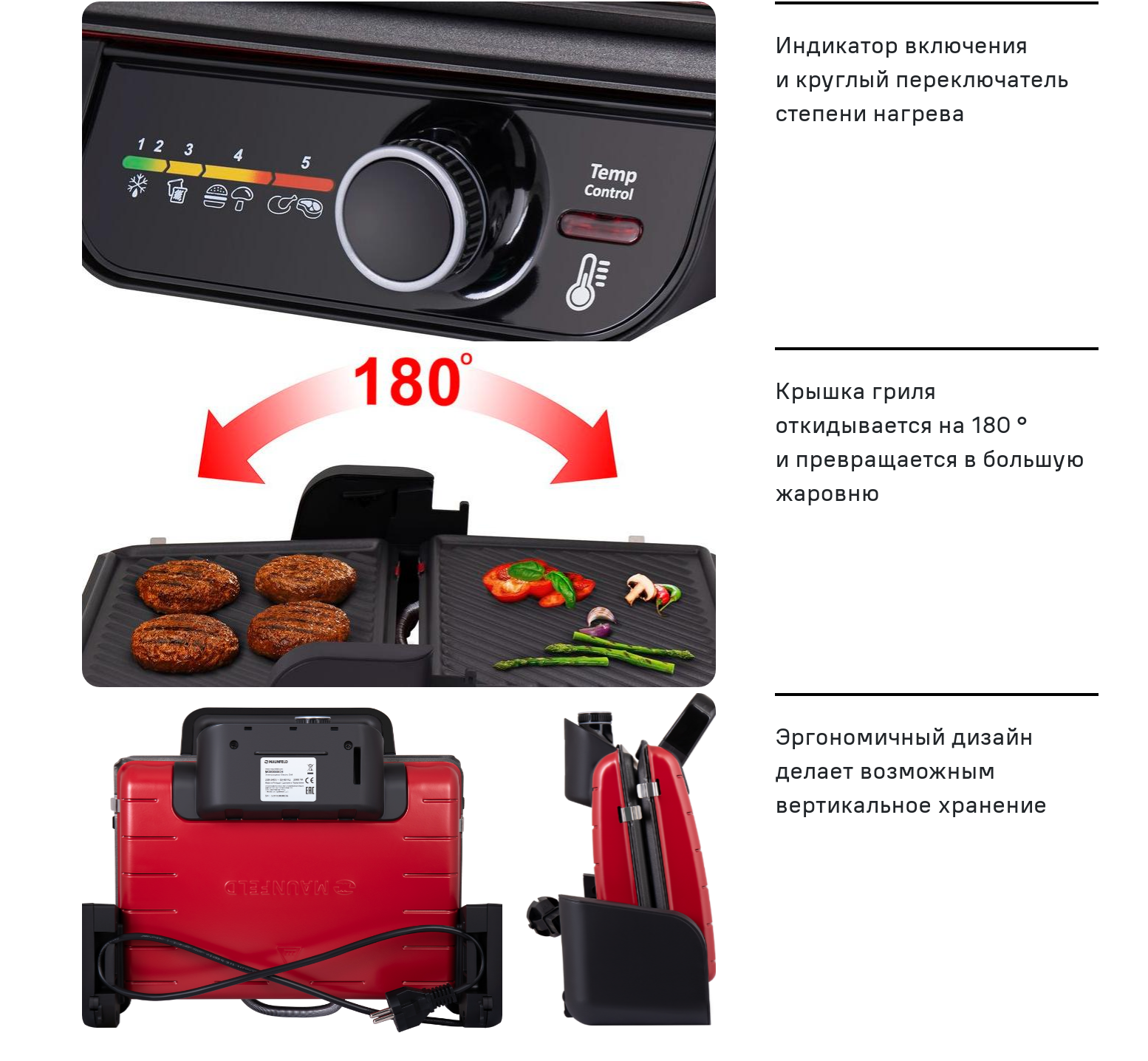 Особенности: 5 режимов нагрева, лоток для сбора жира, в одностороннем режиме крышка гриля откидывается на 180 °, и гриль превращается в большую жаровню. Для приготовления можно использовать обе поверхности. Есть индикация включения.
