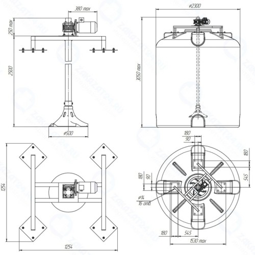 - Гиперболическая мешалка - самоцентрирующаяся, не требуется установка дополнительных опор на дне емкости при длине вала до 6 метров.