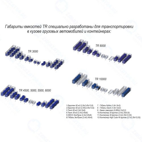 2. Линейка емкостей серии TR включает емкости объемом: 3 000л; 4 500л; 5 000л; 5 500л; 6 000л; 8 000л; 10 000л.