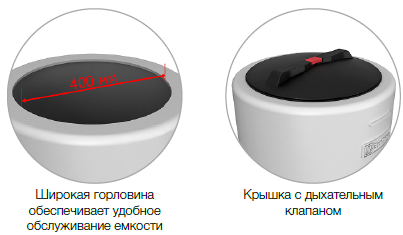 Широкая горловина емкости обеспечивает удобство дезинфекции. Крышка оборудована дыхательным клапаном, который не позволяет веществам внутри испортиться, воде – «зацвести». В нижней части емкости находятся 4 плоские площадки под установку отводов до 2’’.