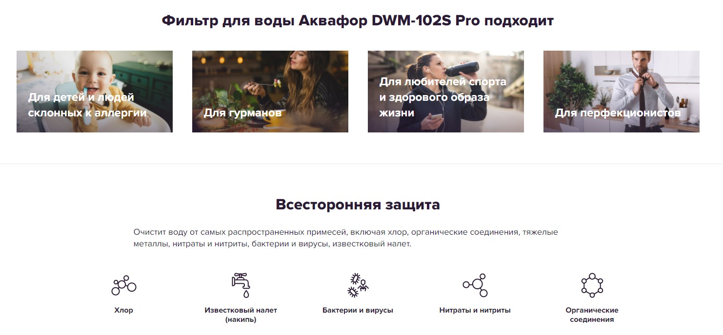 DWM-102S Pro очистит даже самую сложную воду, удалив из нее любые примеси: все самые распространенные токсиканты, бактерии и вирусы. Фильтр полностью умягчает воду: из чайника исчезнет накипь, а домашние блюда станут еще вкуснее и полезнее.