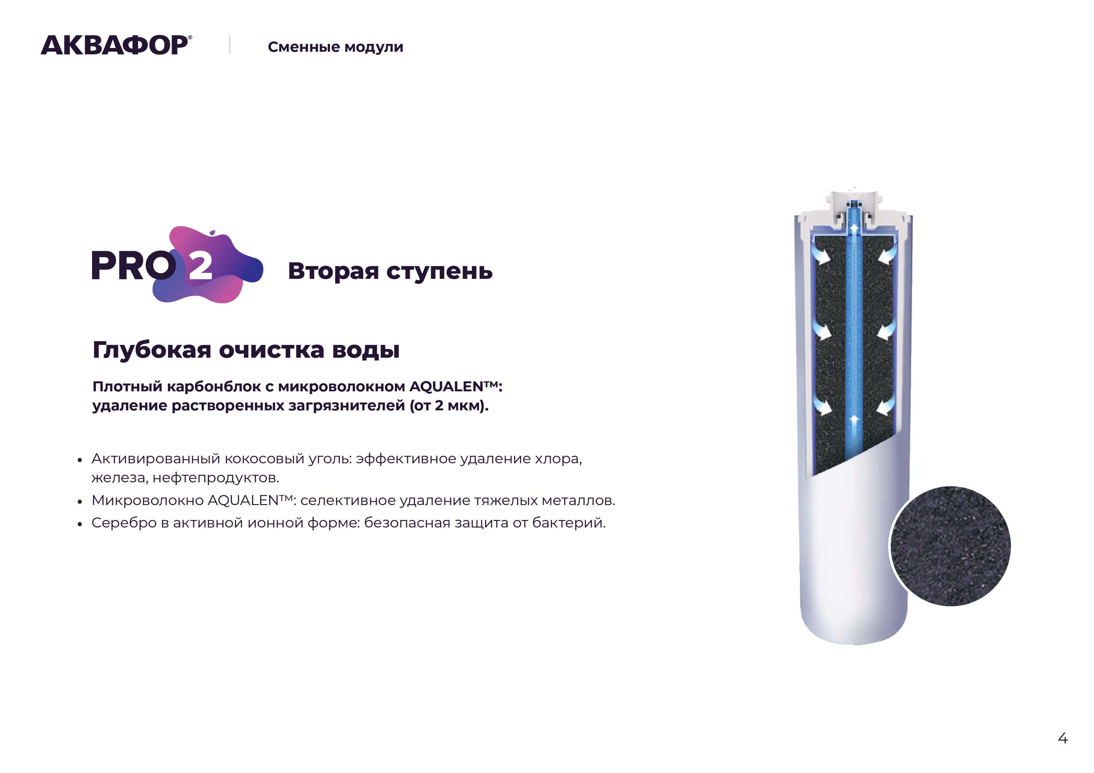 Cистема предназначена для глубокой очистки воды от техногенных и антропогенных загрязнений. Удаляет активный хлор, тяжелые металлы, железо (Fe2+), марганец, органические соединения, а также антибиотики, гормоны, радионуклиды и свободные радикалы даже в сильно загрязненной воде.