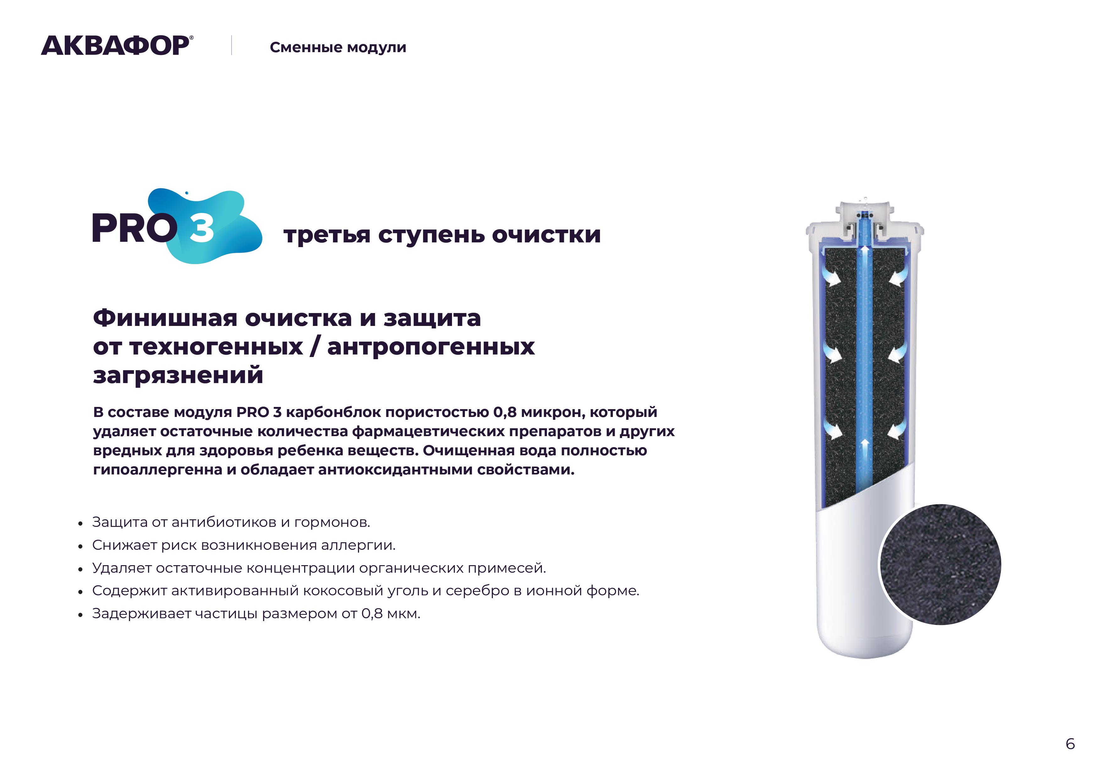 Присутствие фармацевтических препаратов в питьевой воде уже признано ВОЗ новым глобальным вызовом. В системе Baby Pro абсолютная защита от следовых количеств обезболивающих, антибиотиков, гормонов и других химических загрязнений обеспечивается сочетанием запатентованных технологий АКВАФОР и уникальными сорбционными средами.