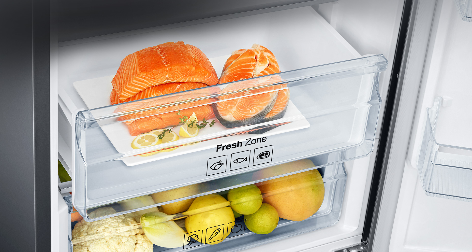 Зона свежести (Fresh Zone) представляет собой выдвижной ящик, в котором создаются идеальные условия для хранения мяса и рыбы, поскольку в нем поддерживается оптимальная температура и эти продукты долго сохраняются в наилучшем виде.