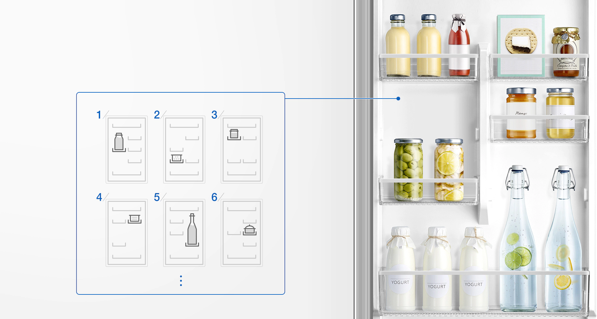 Регулируемые дверные полки Настройте пространство в двери холодильника с помощью 4 дверных съемных полок, которые позволяют легко приспособить их для хранения ёмкостей самых разных размеров. Возможность регулировать их по высоте позволяет использовать пространство по максимуму.