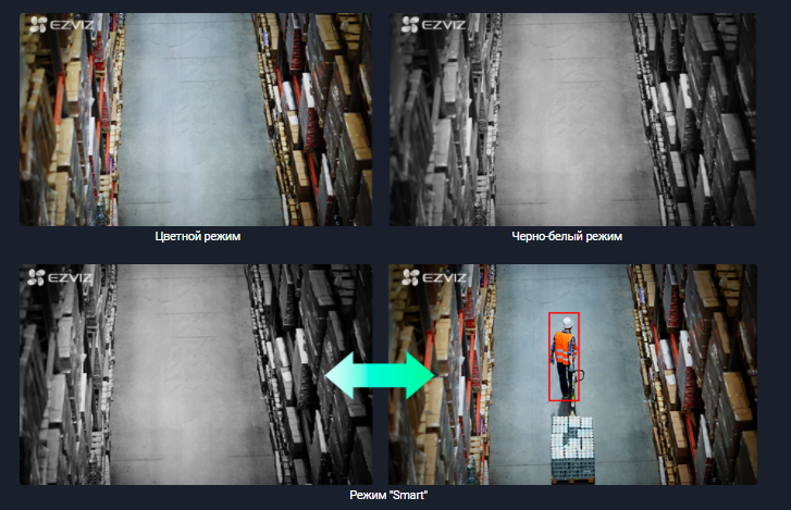 Если дополнительное освещение вам не нужно, просто переключите камеру в черно-белый режим ночного видения через приложение EZVIZ. Вы также можете выбрать интеллектуальный режим ночного видения. В этом режиме C3N автоматически переключается с черно-белого на цветной, включая прожекторы при обнаружении движения человека.