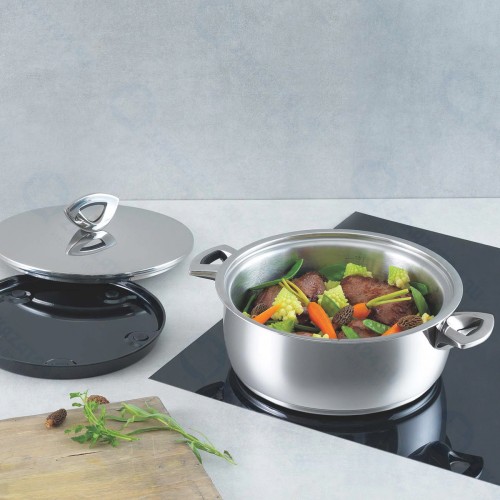 Кастрюля Kuhn Rikon Durotherm, 3 л (30452) подходит для использования на плитах разных типов, включая индукционные варочные поверхности. Для доведения блюд до готовности предназначена специальная подставка, которая сохраняет тепло и предотвращает быстрое остывание посуды. Благодаря многослойному дну Superthermic обеспечивается равномерный нагрев. Это препятствует прилипанию пищи, что позволяет с легкостью очистить изделие от загрязнений. С помощью крепких ручек, имеющих эргономичную форму, можно удобно и надежно держать кастрюлю. Модель произведена из нержавеющей стали высокого качества, которая характеризуется оптимальной прочностью и устойчивостью к внешнему воздействию, образованию коррозии.