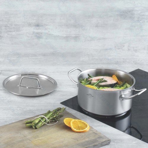 Кастрюля Kuhn Rikon Montreux, 4 л (37283) позволяет готовить блюда на плитах как с электрическими, газовыми, стеклокерамическими конфорками, так и индукционными. Благодаря многослойному дну Superthermic при нагреве обеспечивается равномерное распределение тепла, что препятствует прилипанию пищи к внутренней поверхности модели. Крепкие ручки надежно присоединены к основанию и имеют эргономичную форму, за счет чего кастрюлю удобно держать и переносить. Для производства используется нержавеющая сталь, которая характеризуется оптимальной прочностью, устойчивостью к внешнему воздействию, возникновению коррозии. Удалять загрязнения с изделия можно вручную специальными средствами и губкой или в посудомоечной машине.