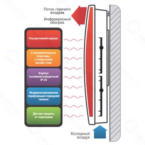 Процесс обогрева помещения происходит следующим образом: холодный воздух поступает в конвекционную камеру через воздухозаборник. Далее воздух проходит через систему нагревательных пластин. Нагревательные пластины испускают инфракрасные лучи, которые нагревают предметы в помещении. В конвекционной камере воздух, нагреваясь, поднимается наверх и выходит через воздуховыпускные решетки.