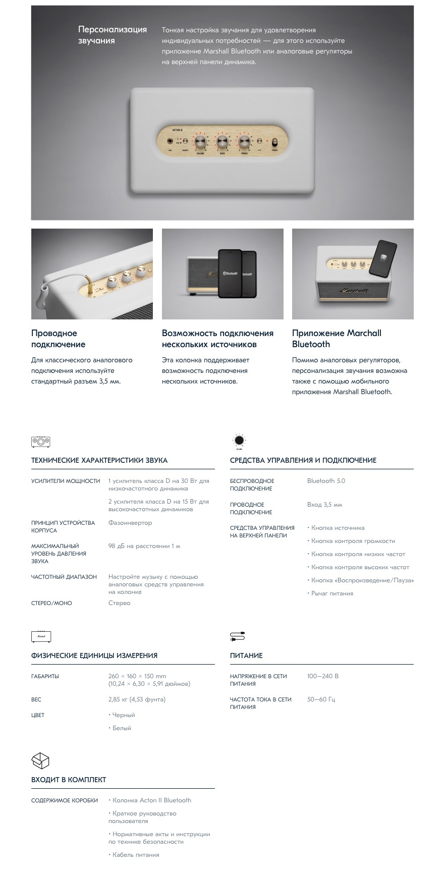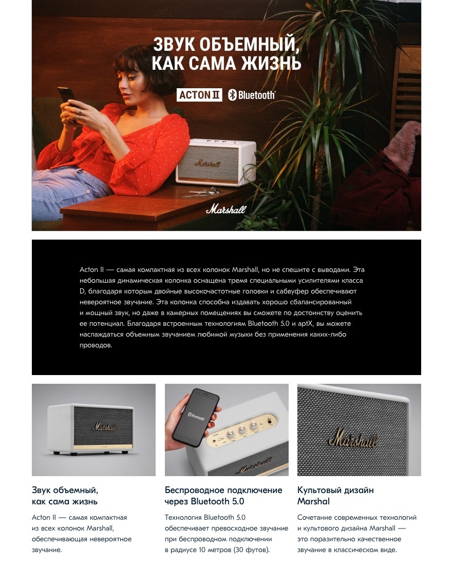 Но Marshall славится не только дизайном, три динамика и фазоинвертор создают глубокое, натуральное звучание с широкой сценой, высокой степенью натуральности, мощным басом и звонкими верхними частотами. Корпус хорошо демпфирован и справляется с вибрациями, а также не допускает окрашивания звука. Таким образом, Marshall Acton II воспроизводит именно тот звук, которого хотел добиться автор произведения.