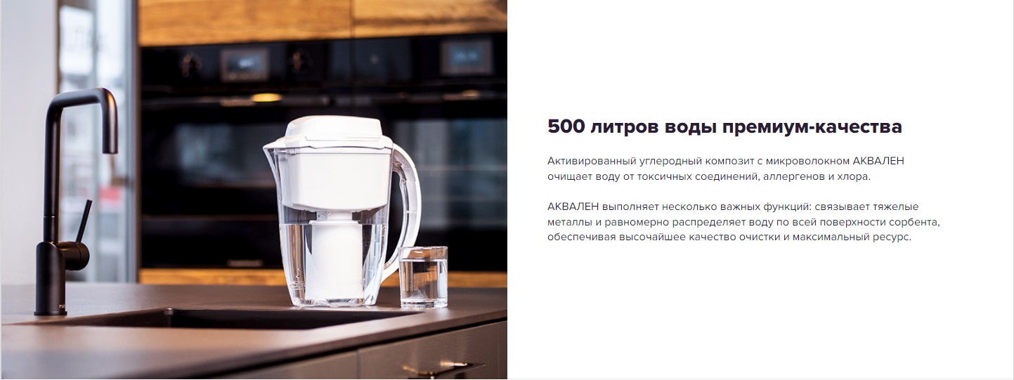 За глубокую очистку от растворенных токсичных примесей — хлора, хлорорганики (канцерогенов) и тяжелых металлов — отвечает композит из активированного угля и ионообменного микроволокна АКВАЛЕН™. Половолоконная мембрана обеспечивает финишную очистку воды от частиц размером до 0,1 микрона, а также бактерий и паразитов, устойчивых к хлору. Фильтрованная вода гипоаллергенна и подходит для приготовления детского питания. Защиту от бактерий обеспечивает микрофильтрационная мембрана - мелкое “сито” с миллиардами пор размером 0,05 - 0,1 мкм, что в 800 раз меньше человеческого волоса. Это значительно меньше размера бактерий или кишечных паразитов, а значит вода безопасна для детей, людей страдающих аллергиями и пожилых, кипячение не требуется