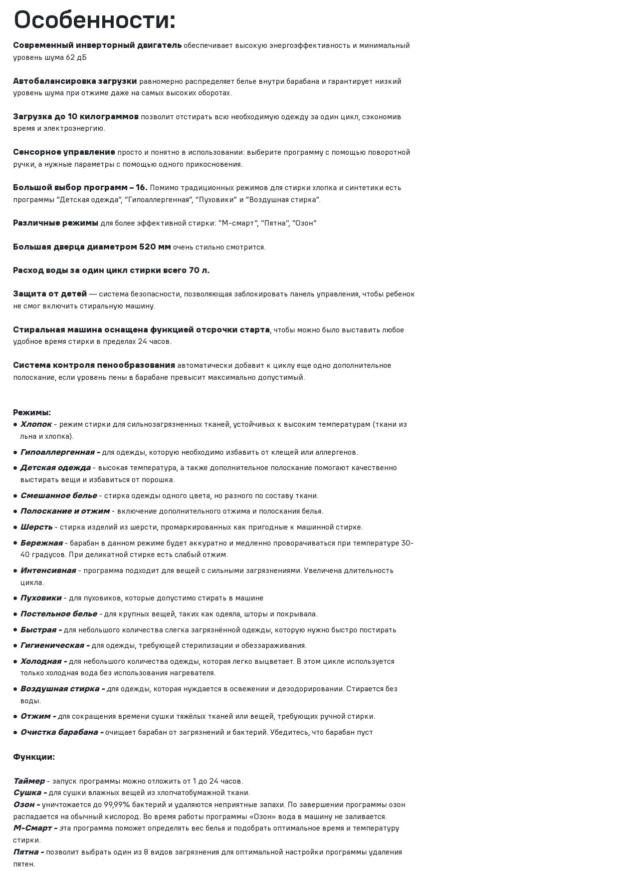 | Максимальная загрузка белья | 10 кг |
