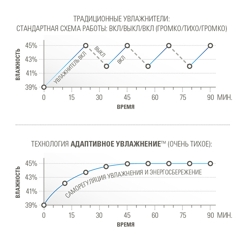 Если прибор используется не в автоматическом режиме, вы можете самостоятельно выбрать один из пяти уровней интенсивности увлажнения и уровень влажности – от 30% до 75%, с шагом 5%. В ночном режиме прибор работает практически бесшумно, чтобы обеспечить вам комфортный сон.
