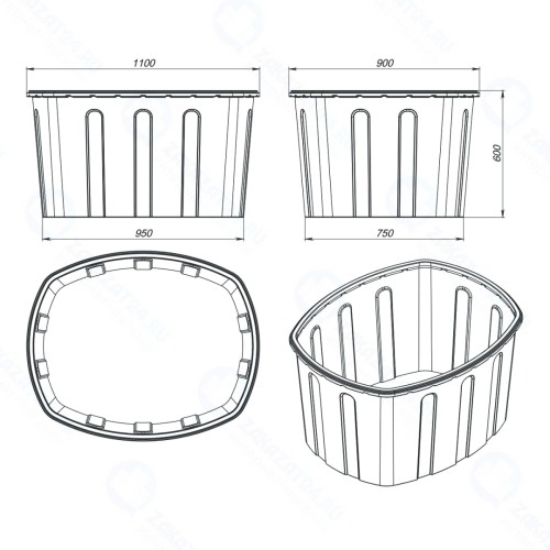 Форма ванны заужена в нижней части, что позволяет складывать ванны одна в другую (штабелировать), что упрощает транспортировку и хранение.