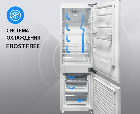 ![]() | СИСТЕМА ОХЛАЖДЕНИЯ FROST FREE Сухое и холодное пространство равномерно продувается во множестве точек холодильной и морозильной камеры посредством вентилятора. |