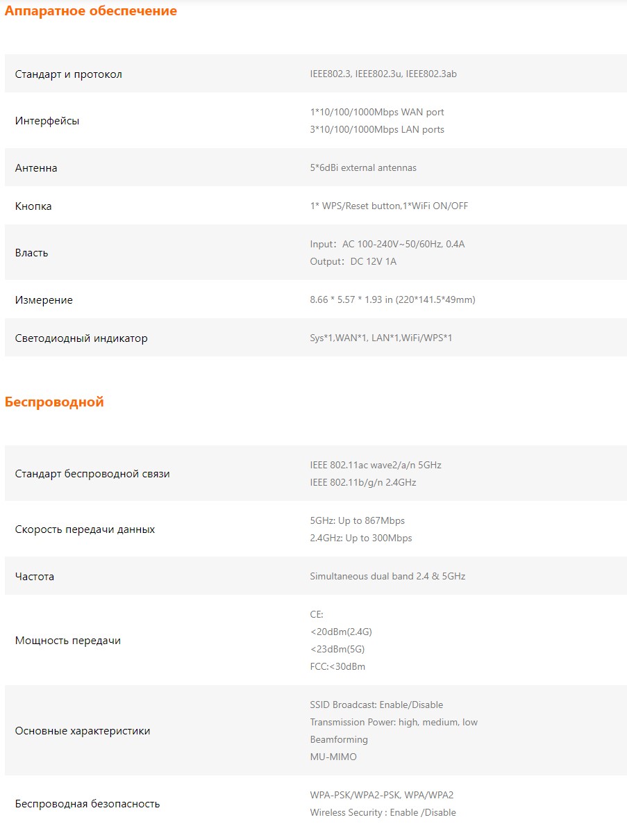 | Стандарт Wi-Fi | WI-FI 5 (802.11ac), WI-FI 3 (802.11g), WI-FI 4 (802.11n) |